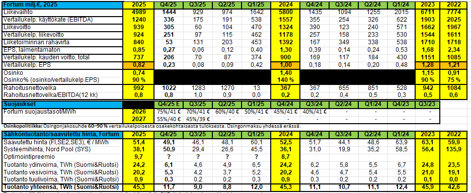 Det verkar inte finnas någon större dramatik i utsikterna, vid en första anblick har säkringsnivåerna stigit ganska snabbt. Som jag sade i förhandstitten har elterminerna för 2026 stigit fint i början av året, vilket torde vara den största faktorn bakom prognosändringarna. Givetvis är 75 % av 2026 års produktion redan låst till priset 41 €/MWh, så det syns ju inte direkt i resultatet.