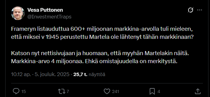 Now that I’ve already sold my shares, I can mention that it’s a bit surprising that the investor of the year 2023 and investment author calculated Framery’s 2024 P/E ratio to be 21.5 with a share price of 8€. At that price, I would have kept mine and probably bought more today. Framery has, after all, progressed this year. The 2024 net profit was 19.566M€ and the market value was, as I understand it, 633.1M€ at the IPO. From this, we get a 2024 P/E of 32.4. Quite a big difference compared to Esa’s figure. Last year’s P/E ratio is not very relevant, but it undermines the entire analysis. It happens even in better circles.