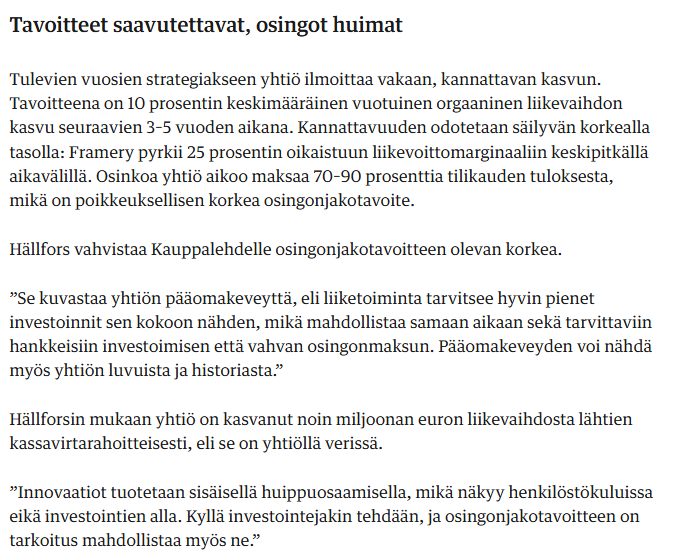 Ompas mielenkiintoinen listautuja tulossa pörssiin! Kriittinen pitää aina olla, mutta onhan tämä piristävää, että Suomen pörssiin saada uusia tulokkaita. Aina löytyy plussia ja miinuksia, mutta Framery on kyllä mielenkiintoinen tapaus, kun kyseessä aidosti kasvava kv-yhtiö.