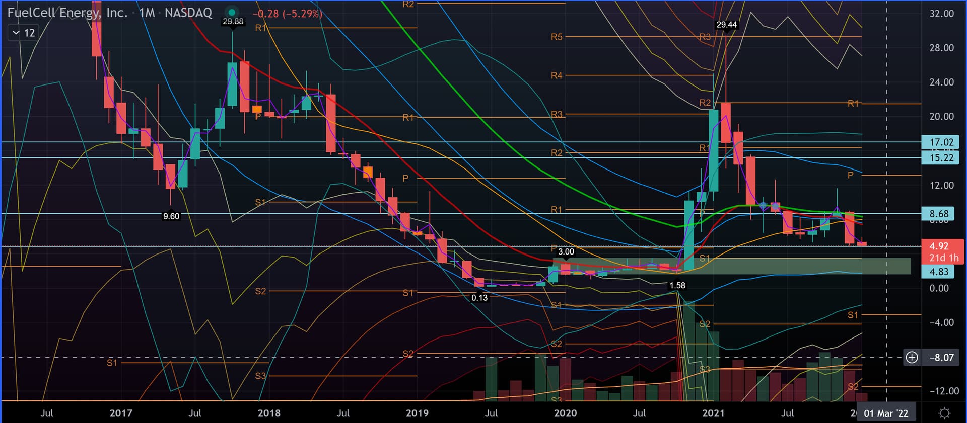 Sry, en ole ollut paljon langoilla. Minun määrittelemä support zone chartissa on 3.50-1.58 - jos tuo aikaisempi weekly support 4.83 ei tule pitämään (nythän breakdown oli vielä aika vähäinen kun käytiin 4.68, joten ennenaikaista vielä sanoa jatkosta), niin 3.50 on itselleni seuraava support (aikaisemmat pivotit sillä tasolla sekä yearly pivot std S1 level).