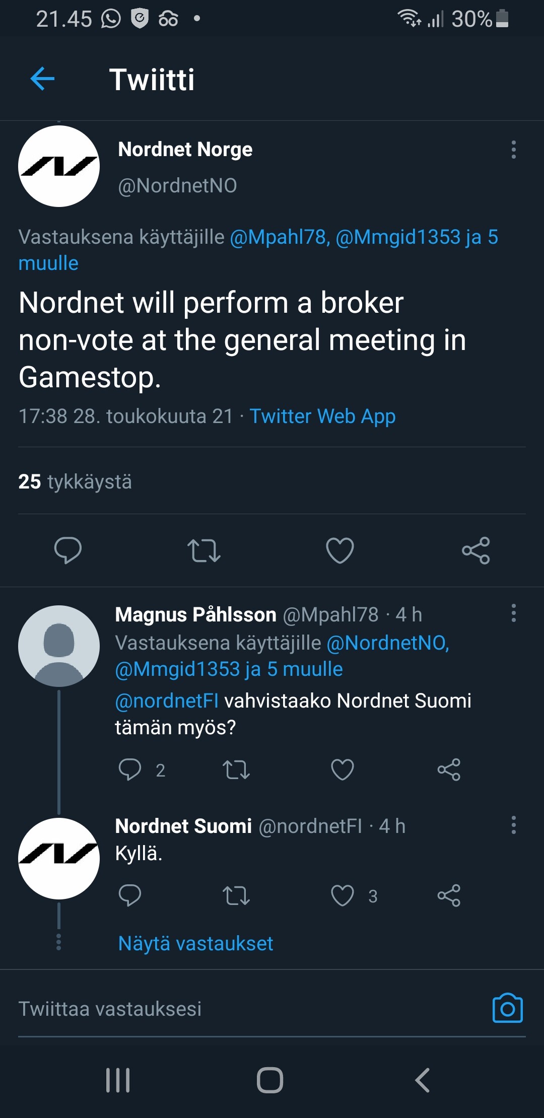 Sekä Nordnet että Avanza taipuivat ja ilmoittavat Gamestop yhtiökokoukseen, että heidän asiakkaansa eivät äänestä mutta edustavat x miljoonaa osaketta.