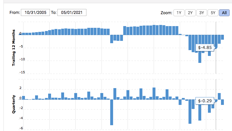 Tähän kuvaan Q2 EPS ei ole vielä päivittynyt, mutta jos sama trendi jatkuu, voi jo Q3 olla positiivinen, sillä puristus -0,29$:sta positiivisen puolelle tänä vuonna jo nähdyllä kehityksellä ei pitäisi olla mahdoton. Q4 nyt on melko varmasti positiivinen myös tänä vuonna.