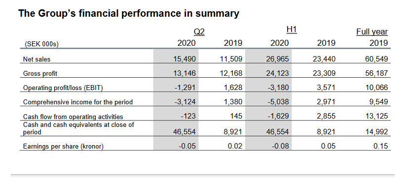 Comprehensive income for the period totaled SEK -3,124 (1,380) thousand.