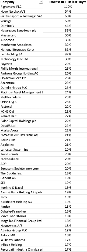 Here is a list of “ROIC aristocrats” encountered on X https://x.com/long_equity/status/1712116216876196215?s=20