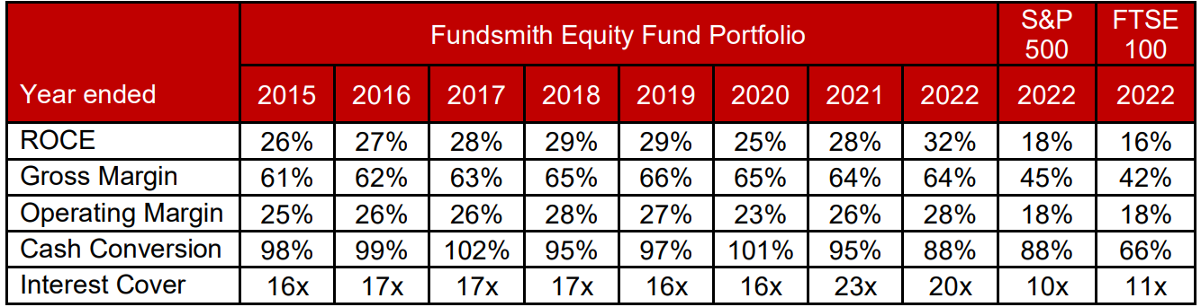 Fundsmith also publishes a so-called look-through table similar to Sifter’s, which describes the quality of their holdings:
