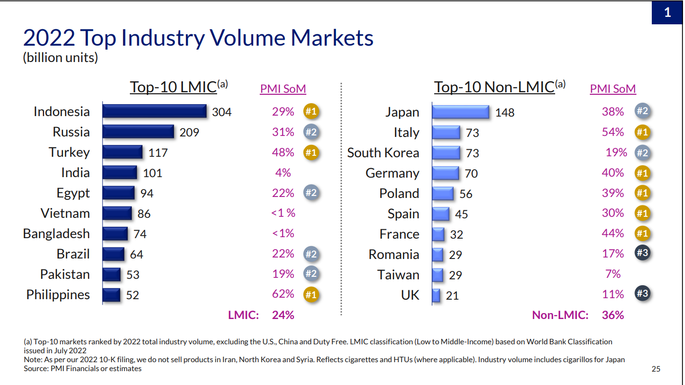 Additionally, for those who are just now hearing about Philip Morris as an investment, the “International” part of the company’s name is because the license for Philip Morris’s traditional tobacco products in the USA is held by Altria (also in the list linked by Atte). Below are the market shares of the traditional side in the largest markets (before Swedish Match).
