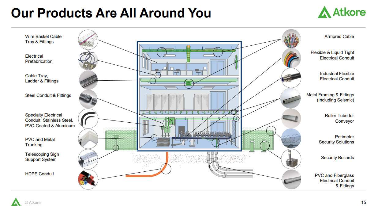 Oma ehdotukseni laatuyhtiöksi on Yhdysvaltalainen keskisuuri teollisuusyritys Atkore (NYSE:ATKR). Yhtiö valmistaa nykyään pääasiassa sekalaisia sähköinfrastruktuurin tuotteita kuten sähköjohdin/kaapelointi/kotelointiratkaisuja sekä muita sähköalaan liittyviä ja liittymättömiä infrastruktuurituotteita (metal framing, mechanical pipe, perimeter security, and cable management; kts. kuva).