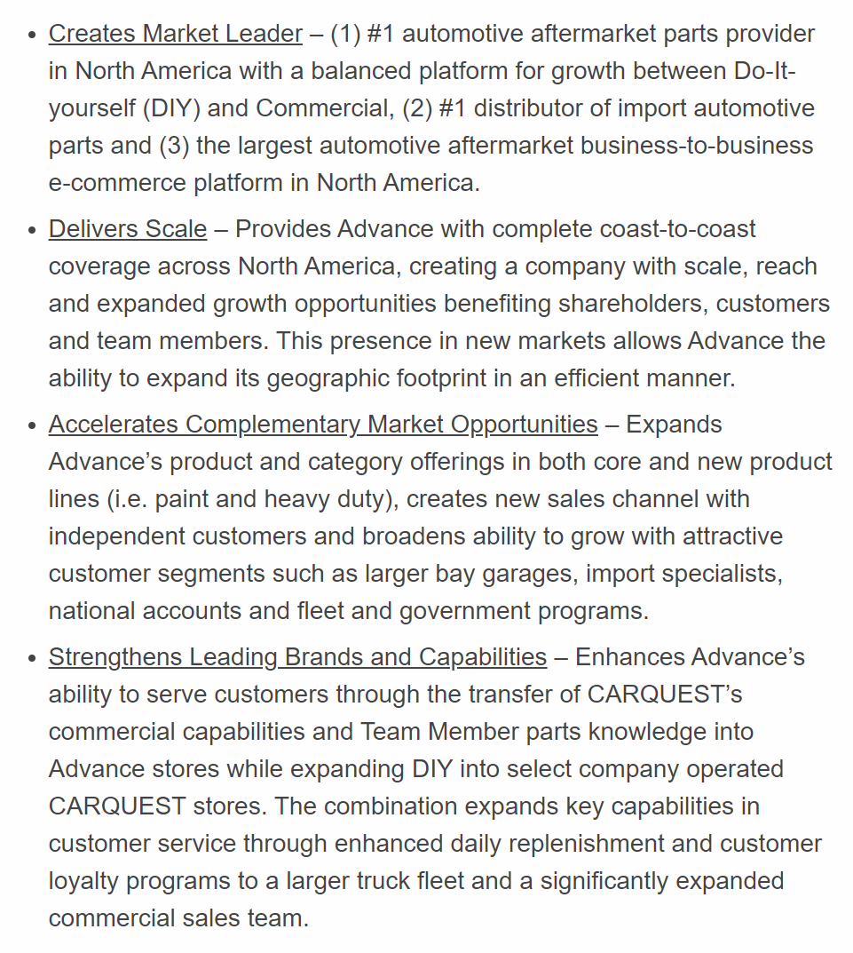 Advance Auto Parts on yksi alan kolmesta suuresta pelurista ja yhtiö oli vielä vuosina 2000-2013 Autozonen ja O’Reillyn kanssa samassa veneessä. Liikevoitto seitsenkertaistui vuodesta 2000 vuoteen 2013, ROE-% heilui erinomaisesti välillä 22-45% ja yritys osti vähän yli kolmanneksen omista osakkeistaan pois markkinoilta. Kannattavuus ei kuitenkaan koskaan noussut liikevoittomarginaalilla mitattuna yli 11%. Yhtiön johto näki, että sen piti laajentaa imperiumiaan noustakseen uudelle tasolle ja päätti vuonna 2013 ostaa General Parts Internationalin noin 2 miljardilla.
