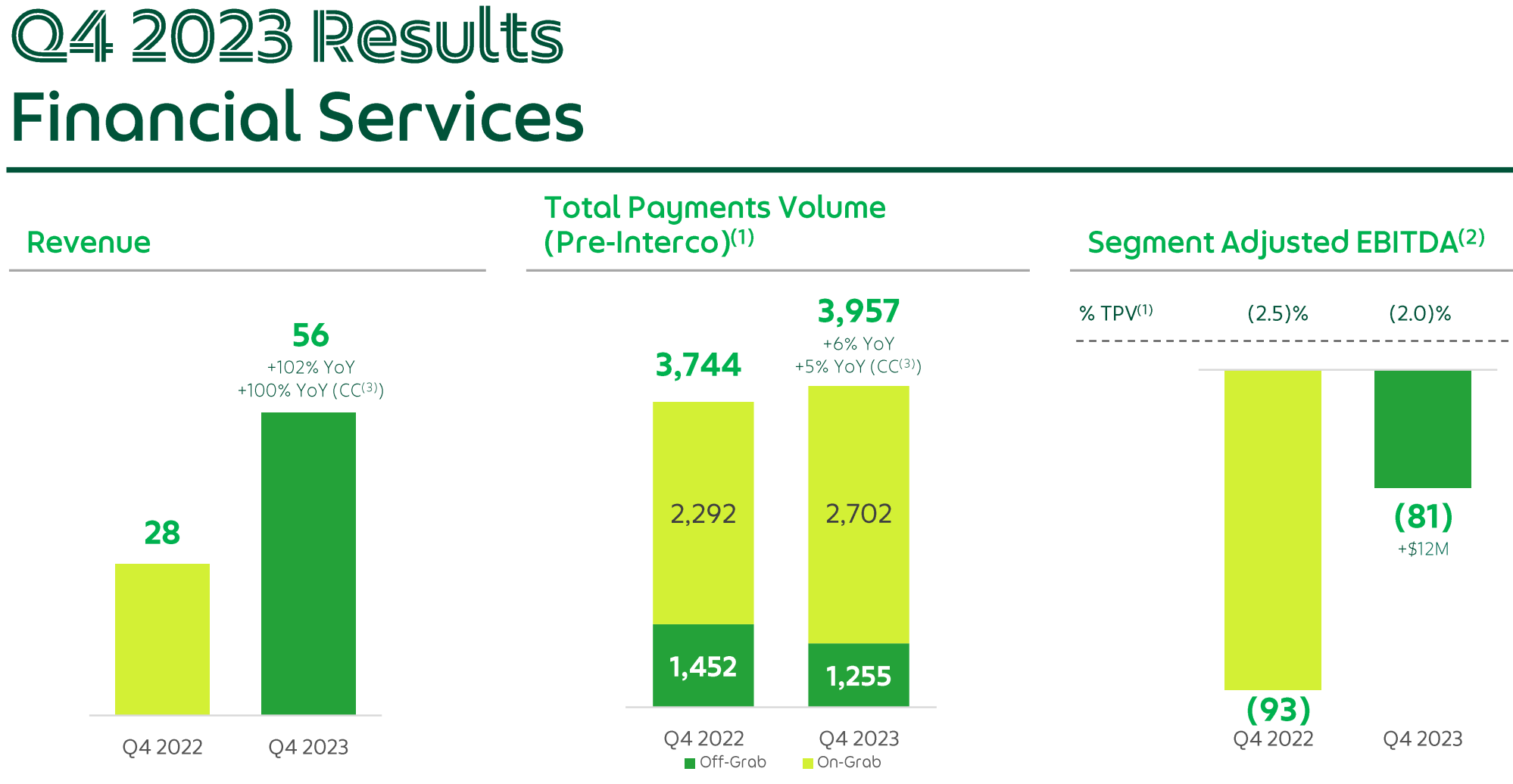 Grab teki voittoa Q4 niin kuin odotettiinkin. Sijoittavat palkitsivat -10% dipillä. Johtuikohan siitä että 2023 Adjusted EBITDA oli -22milj ja ensi vuodelle odotetaan +180-200milj.