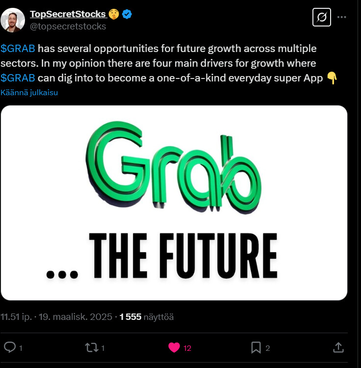 Alla olevassa tviittiketjussa tuodaan esille, miten GRABilla on vahvat kasvumahdollisuudet useilla aloilla. Yhtiö laajentaa digitaalista pankkitoimintaa, BNPL-palveluita ja lohkoketjuratkaisuja. Yhtiö myös kehittää logistiikkaa, tekoälyratkaisuja, terveyspalveluita ja vakuutuksia sekä laajenee uusille markkinoille ja jopa “maaseutualueille”.