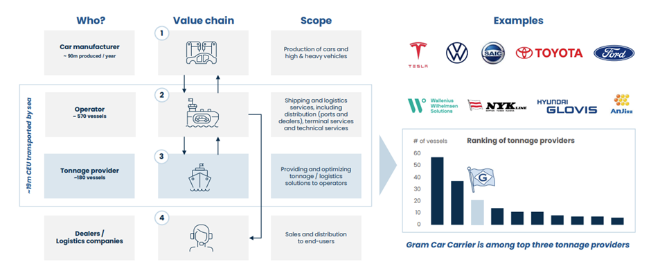 GCC owns 19 Distribution, Mid-size, and Panamax class car carrier vessels, which it leases out. Its customers are largely large & listed car carrier operators, such as Glovis, Wallenius Wilhelmsen, and Höegh Autoliners, which reduces counterparty risk. GCC is responsible for the operational maintenance and management of the ships, but the risk for the demand of the end product (i.e., cars) lies with the lessee, which significantly reduces GCC’s business risk profile.