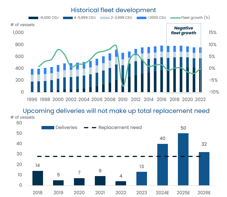GCC leases its ships on relatively long contracts (average 4.5 years), which improves visibility of future cash flows and reduces the risk of spot price volatility. The value of the contract is determined by the daily TC-rate (Time Charter), which has risen sharply in recent years as supply and demand are in a state of extreme imbalance.