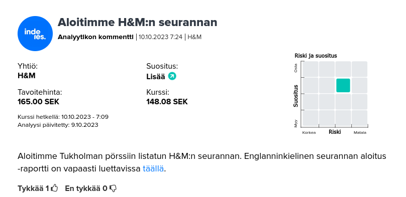 Onko H&M Inderesille maksava asiakas vai aloitettiinko seuranta tukemaan Stockmannin analysointia ja/tai Inderesin kasvua Ruotsissa?