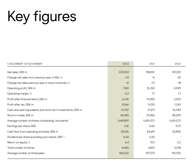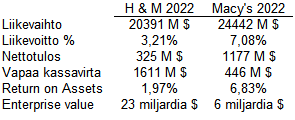 En malttanut olla tekemättä vertailua H&M:n ja Macy’sin kesken, kun molemmat ovat samassa liikevaihtoluokassa ja tuotevalikoimaltaan (muotivaatteet, kosmetiikka) hyviä vertailukohteita. Käytetty vaihtokurssi oli 0,091214 SEK/USD. Luvut otettu yhtiöiden vuoden 2022 vuosikertomuksista.