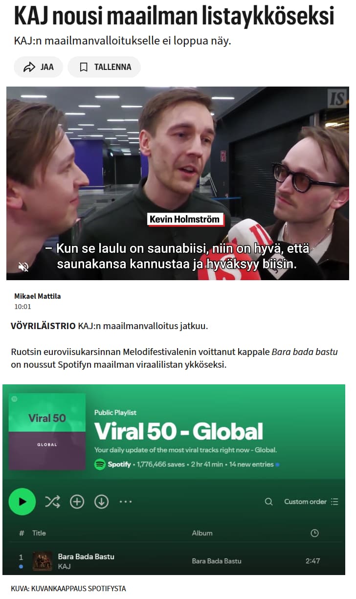 Haluan nyt olla ilonpilaaja, mutta voisiko tämän Euroviisu keskustelun jatkaa kahvihuoneen puolella? Voi Kailla olla pikkuruinen vaikutus tulevaisuuden kassavirtoihin, mutta ei niin suuri kuin mitä Haarumissa on nyt huomiota asialle annettu ![]()