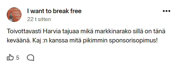 Niinkuin joku taisi jo kirjoitellakin, yritetäänkö rajoittaa näitä Euroviisu/KAJ -jorinoita Harvian sijoitusfoorumilla? Sillä, onko tuo yksi viisuhumppa listoilla 1. vai 13. ei ole oikeastaan merkitystä Harvian kokoiselle pörssiyhtiölle.