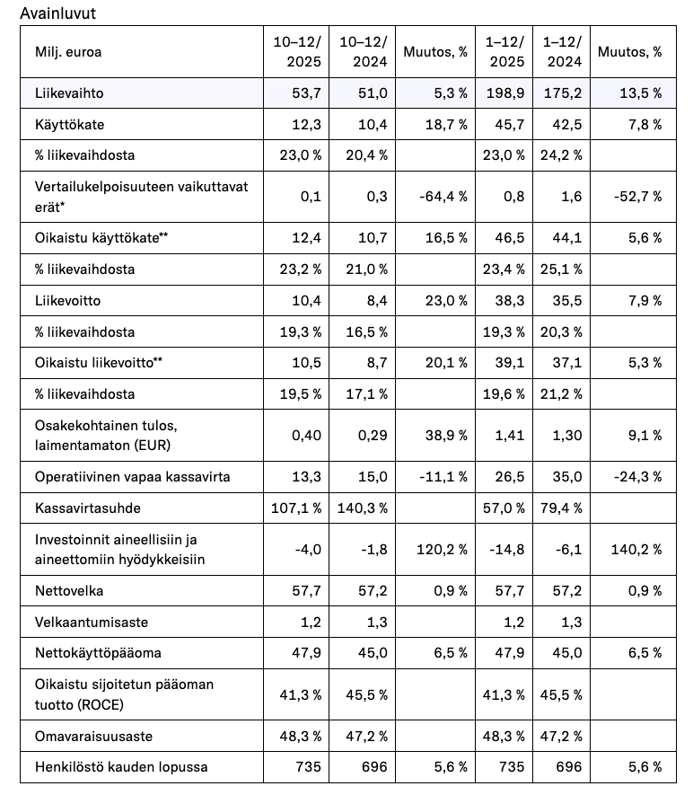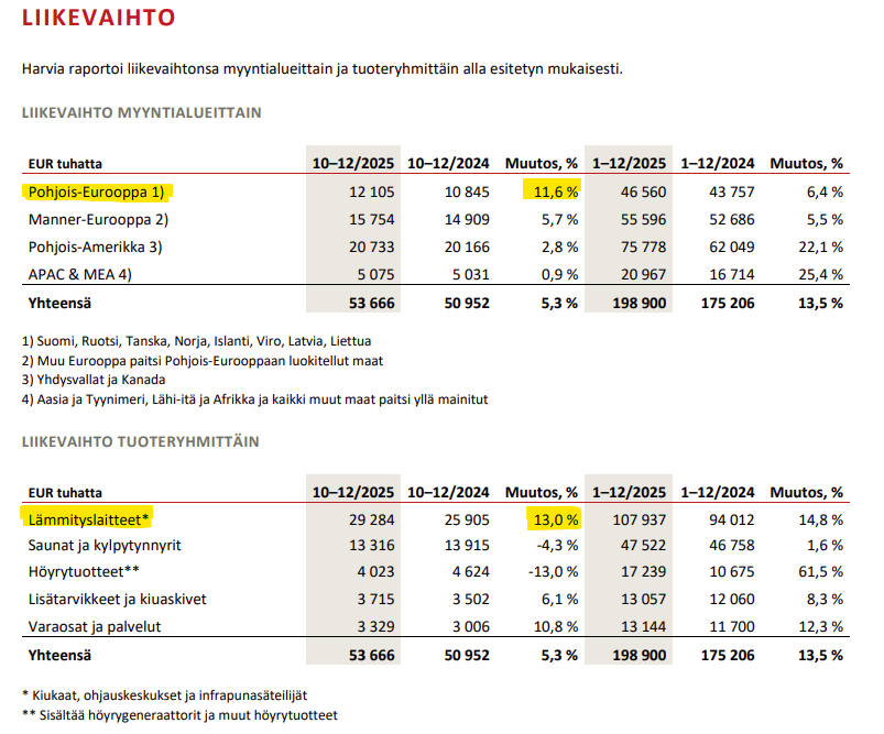 Under det sista kvartalet 2025 fortsatte Harvia att växa på alla marknadsområden trots en mycket stark jämförelseperiod och ogynnsamma valutakurser. Kvartalet var en bra avslutning på året 2025 och visade att Harvia kan leverera ett starkt ekonomiskt resultat och främja genomförandet av sin strategi på ett utmärkt sätt, trots att den omgivande världen har blivit alltmer osäker.