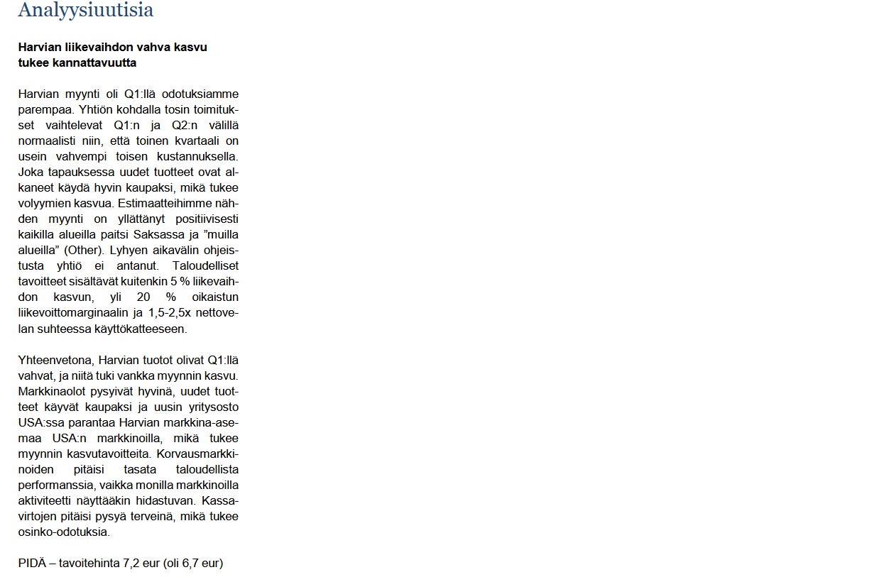 Harvian Q1-raportti oli todella vahva. Liikevaihto ja tulos selvästi yli meidän ja konsensusennusteen.