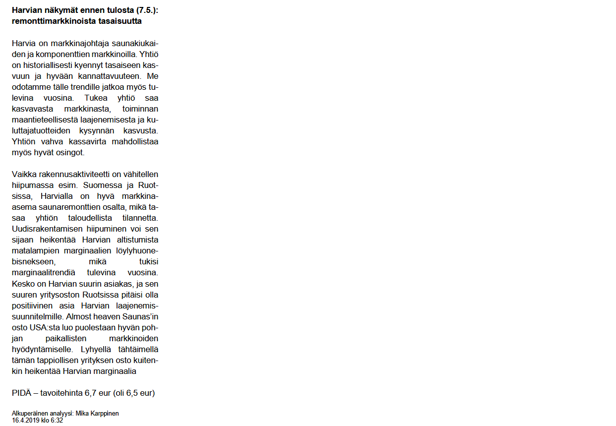 Valuuttakurssitkin näyttävät itänaapurin osalta paremmilta kuin vuosi sitten. Odotuksena tyypillisesti tasaisen vahva tulos, mutta voi olla, että oltaisiinko vähän positiivisemmallakin linjalla. Varauksena toki, että AHS osto ei ole tuonut yllätyksiä ekalle kvarttaalille.