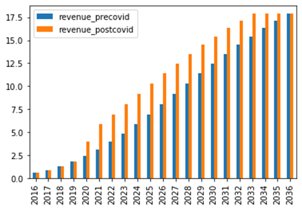 If we assume that from 2016 onwards, the growth rate would have decreased geometrically by 12% per year without the pandemic as the market saturates, we would get the following 20-year growth rates: