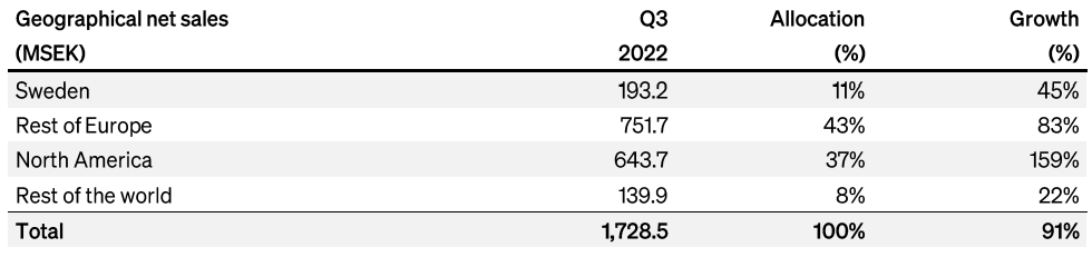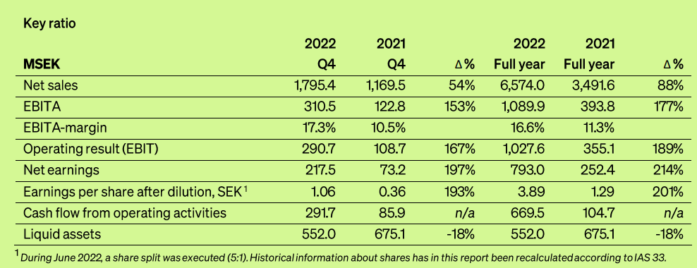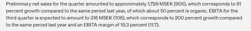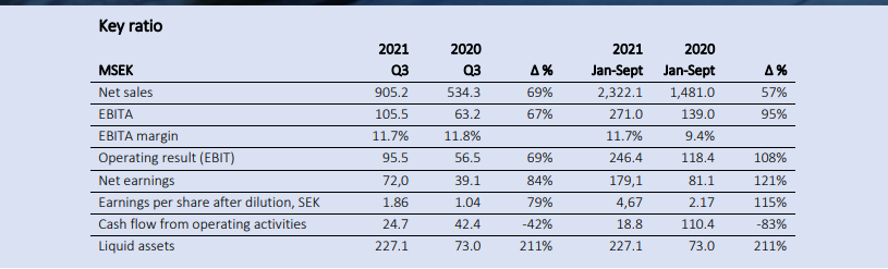 Q3 kasvua 69% ja kasvu ollut kiihtyvää. Kannattavuus (EBIT%) hieman yli 10% ja kannattavuus kärsinyt hieman hetkellisesti materiaali ja rahtihintojen nousun vuoksi, mutta ei mitenkään dramaattisesti (ellei vertaa q2 tulokseen, joka oli poikkeuksellisen vahva)