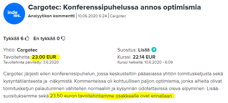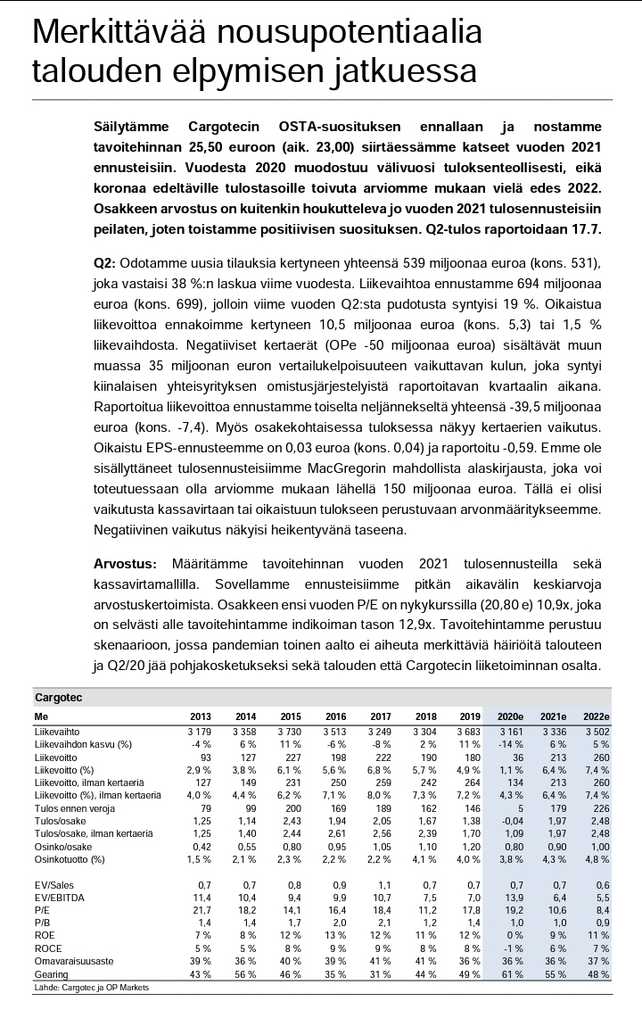 Taitaa vähän nousta “kaikkien noustessa” - Cargotec on kuitenkin isommista firmoista aika laiskasti toipunut virusdipistä ja kun eilen oli vähän semmoinen “myydään teknoja ja ostetaan syklistä”-päivä niin varmaan sen vuoksi nousi. Ei kyllä silti näytä hirveän houkuttelevalta koska Q2 on potentiaalisesti susiruma. Voisin ehkä ostaa Q2 jälkeen jos ottaa ylireaktio-kyykyn.