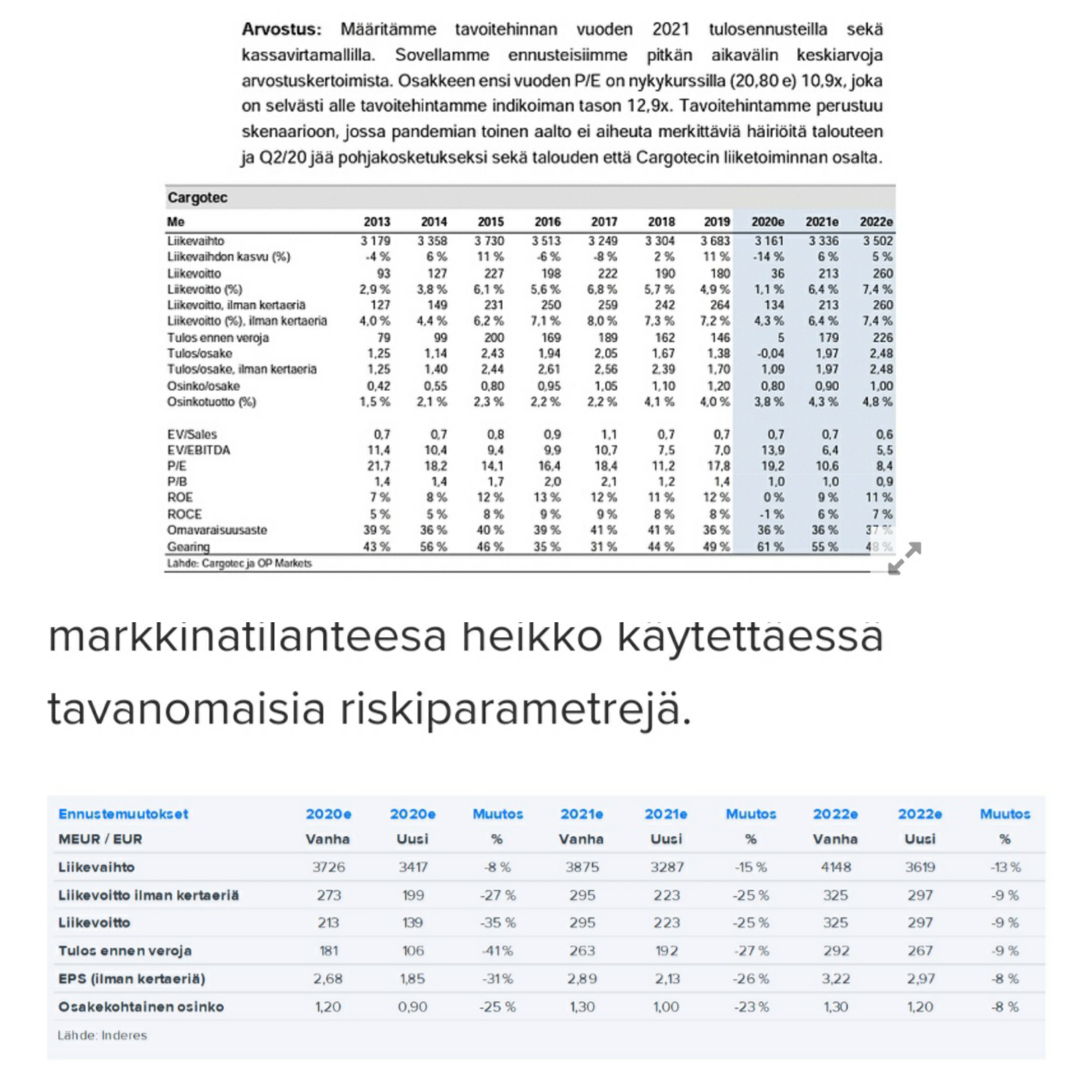 Inderesin arviot ovat olleet optimaalisemmat maaliskuussa kun OP:lla nyt. Inderes laskenut tällöin suositusta 19e, kun taas OP nyt nostaa 25.5e.