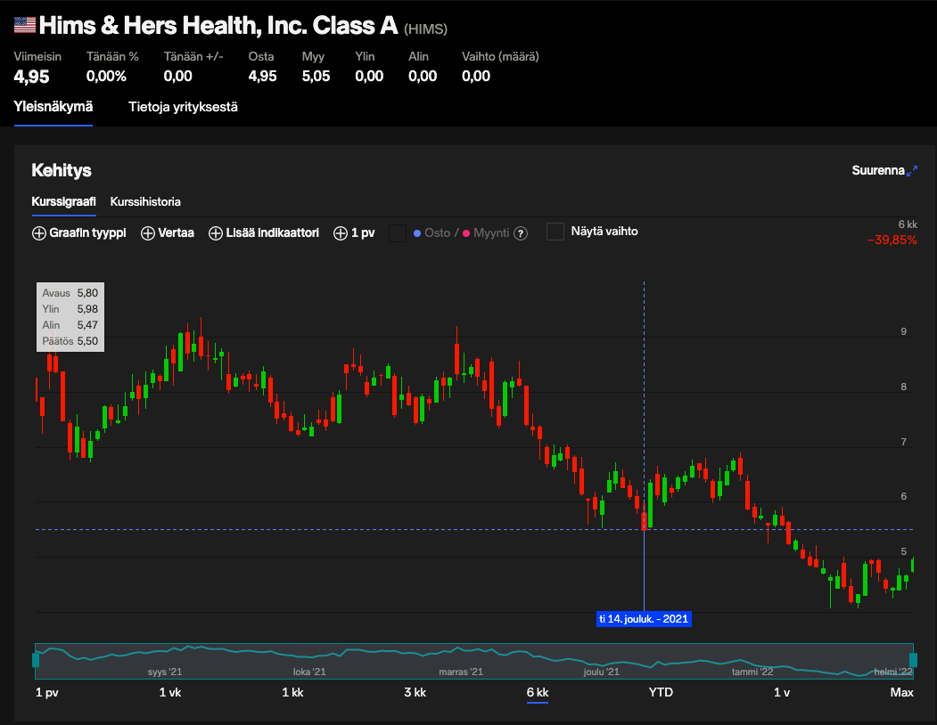 Tuolta kun nopeasti katselee niin hieman sekalaisen kuvan saa sisäpiirin käyttäytymisestä: https://www.nasdaq.com/market-activity/stocks/hims/insider-activity