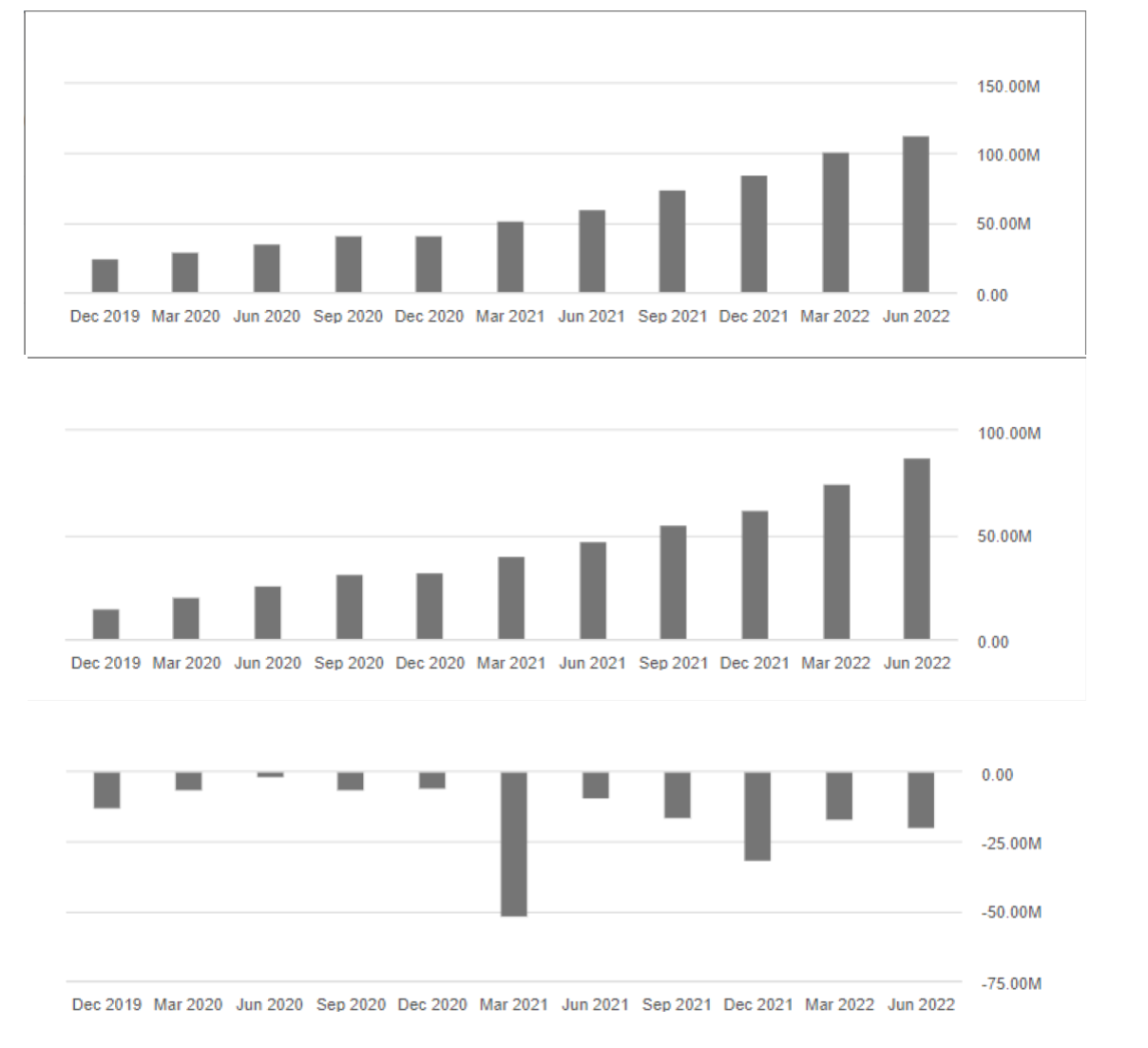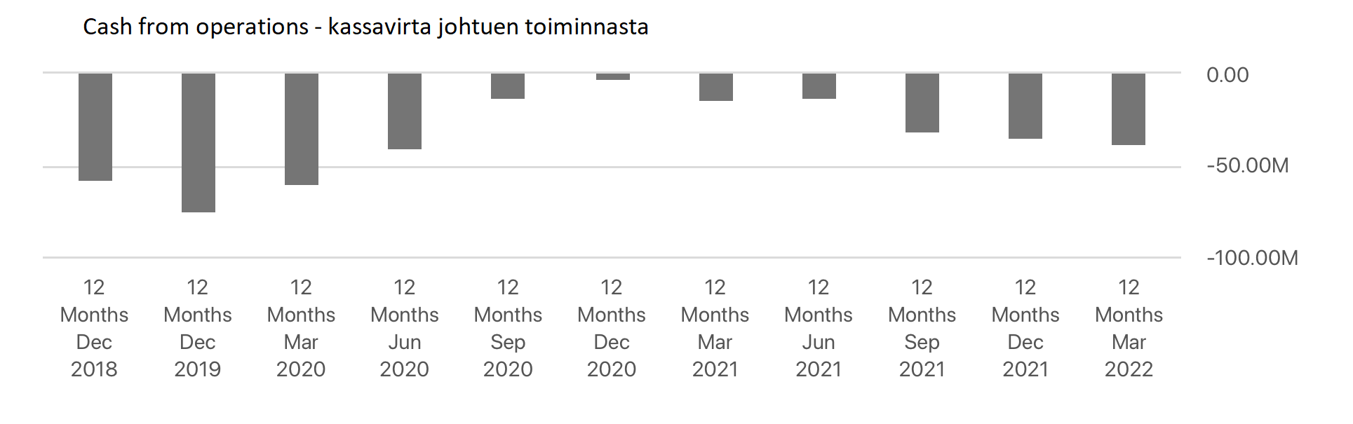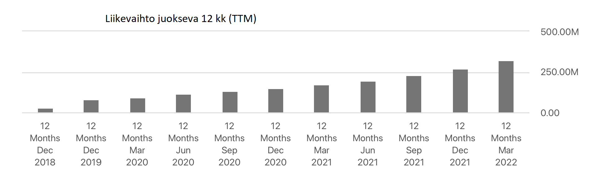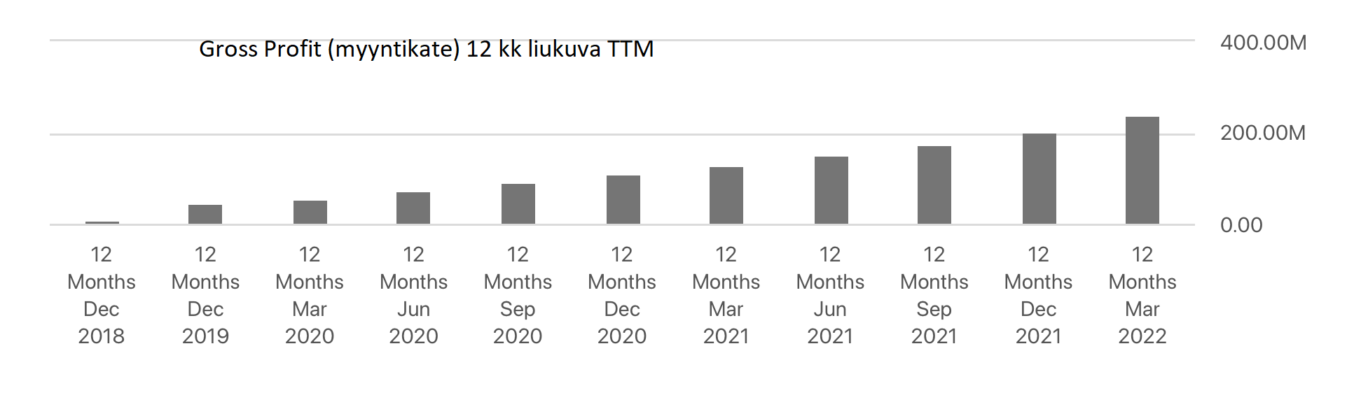 Laitoin alle viimeisimmät 12 kk liukuvat (TTM) liikevaihto, myyntikate ja nettotulos. Kaikki käyrät on kiitettävällä tasolla ja kasvulla. Liikevaihto menee > 80% Y/Y. Tietenkin voi sanoa, että tekee isoa tappiota. Kontraan nyt markkinaa ja totean, että johto investoi ja suunnitelman mukaan käyttää rahaa. Nythän on tahkottava kun firma on pieni, mutta pippurinen. Varmaankin tulee heikompia kvartaaleja, kun makrotalous nyt myllertää korkojen nousun ja inflaation koktailissa. Mutta business antaa numeriden kauttaa itsestään vahvan vaikutelman minulle; ts. yhtiö kestää myös kasvukertoimen laantumistakin.