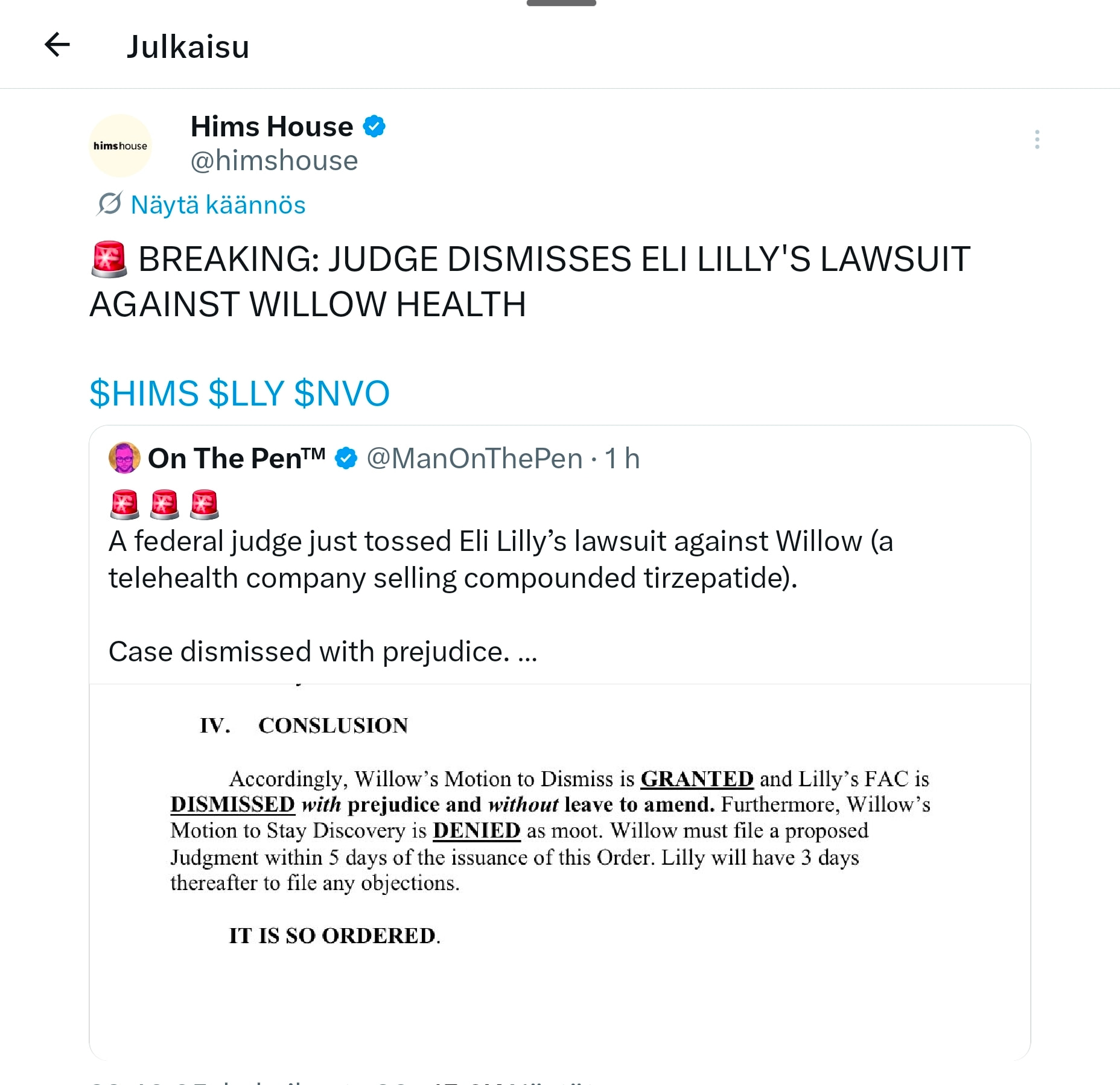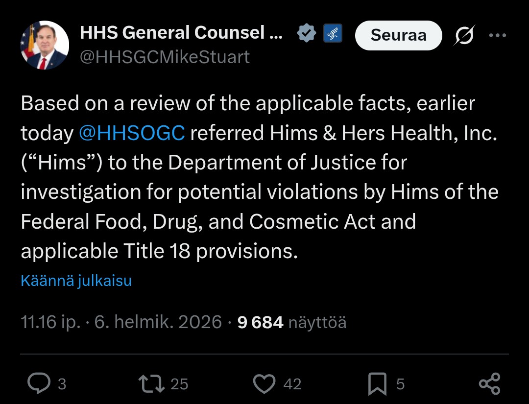 Even though I am an all-in Hims investor, I don’t want to close my eyes to things. My point was just that it feels a bit strange that Novo is trying to struggle with the issue now that Hims is offering a pill, almost as if it was Novo’s last straw. Introducing the pill to the offering now was quite a surprise, but I want to say this clearly: I already considered acquiring Novo shares (lappuja) in the summer for risk management purposes, but the CEO change and Novo’s internal problems did not inspire confidence. In my opinion, Novo should get its own house in order. Did the company not have enough legal expertise to anticipate this whole show? Hims management, on the other hand, has performed excellently. By reading Seligson’s material, I’ve learned to invest in a company whose management you can trust. In reality, these are very complex matters, and a lot is happening in the background that only insiders are fully aware of. My own expertise is not enough to parse it, so all that remains is my trust in the company’s management. Everyone, of course, makes their own conclusions and the money follows accordingly.