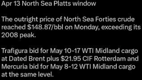 Vaihe 2 (27-30.4.): Megalomaalinen nousu Brentin selvityspäivänä tai pari vuorokautta ennen. Jos Dated Brent pysyy $140+ tasolla, futuurin on pakko konvergoitua kohti ICE Brent -indeksiä.