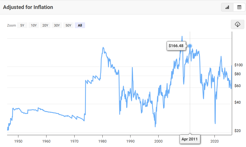 Öljy on historiallisesti nyt ihan oikeastaan “halpaa”. Reaaliset hinnat olivat vuosien ajan nykyistä korkeammalla 2009-2014.