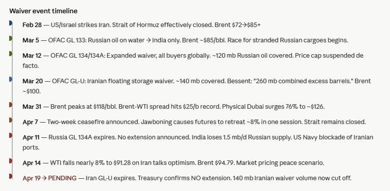 - 2 viikon tulitauko päättyy virallisesti maanantaina 20. huhtikuuta päivää ennen WTI-futuurien erääntymistä. Mahdollisuudet pysyvälle ratkaisulle ovat olemassa, jos vaihtoehto on sodan jatkaminen neuvotteluiden pitkityksen sijaan. Seuraavia neuvotteluita, varsinkaan suoria neuvotteluita, ei kuitenkaan ole vielä sovittu julkisten tietojen perusteella