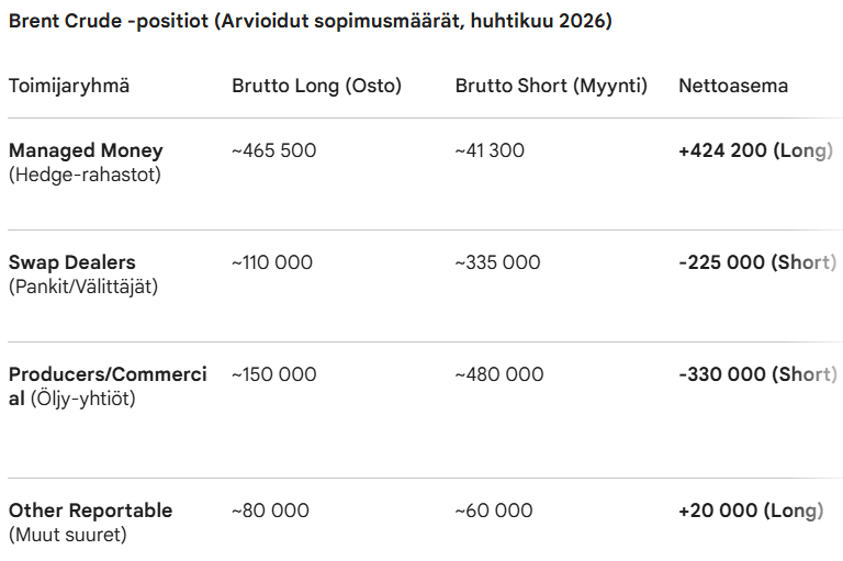 Vuonna 2020: Kun WTI painui negatiiviseksi huhtikuussa 2020, Brentin kokonais-Open Interest (OI) oli noin 2,2-2,5 miljoonaa sopimusta. Markkina oli suuri, mutta se koostui pääasiassa kaupallisista toimijoista, jotka yrittivät selviytyä varastojen täyttymisestä. Nyt (2026): Brentin OI on räjähtänyt 8,3 miljoonaan sopimukseen. Markkinalla on siis lähes nelinkertainen määrä “paperisia” panoksia verrattuna historian suurimpaan romahdukseen.