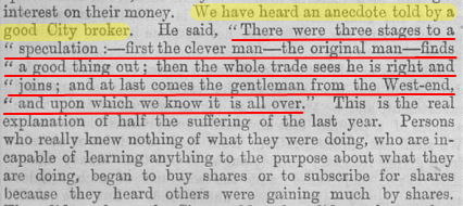Tekstissä myös nostoja, miten tuohon aikaan ylipäätään hankittiin tietoa osakkeista. Päälähteitä oli esim. sanomalehdet, tai monet sijoittajat suosivat yhtiötä joiden toimipisteiden lähellä saattoi asua. Informaation määrä ollut todennäköisesti hyvin matala ja markkina suhteellisen tehoton.