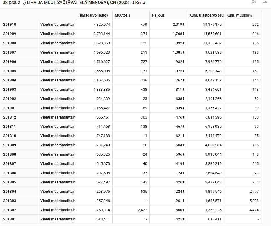 Löytyyhän tuolta tullin sivuilta Uljas-tietokannasta hyvinkin tarkkaa tietoa vientimaista ja -tavaroista kun vähän kaivelee. Tuossa esim. lihan vienti Kiinaan kuukausittain 1/2018-10/2019. Aika messeviä kasvuprosentteja 2019 ja euromääräisestikin jo merkittävää liiketoimintaa. Mielenkiintoista nähdä marraskuun tilastot kunhan ne julkaistaan.