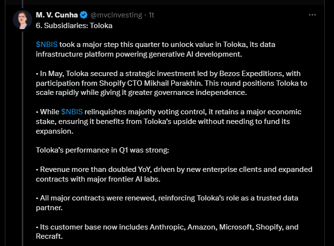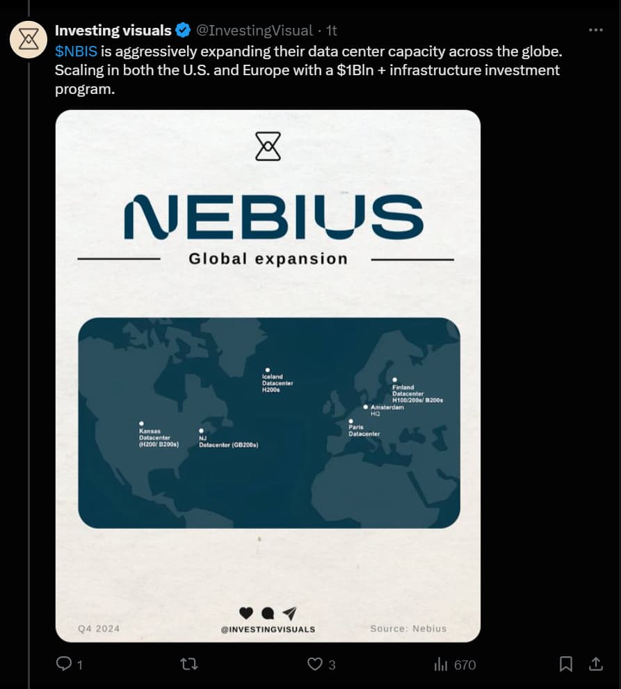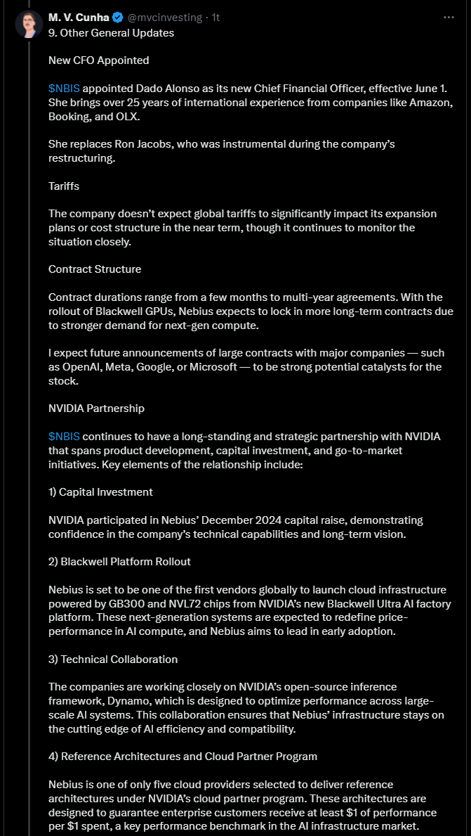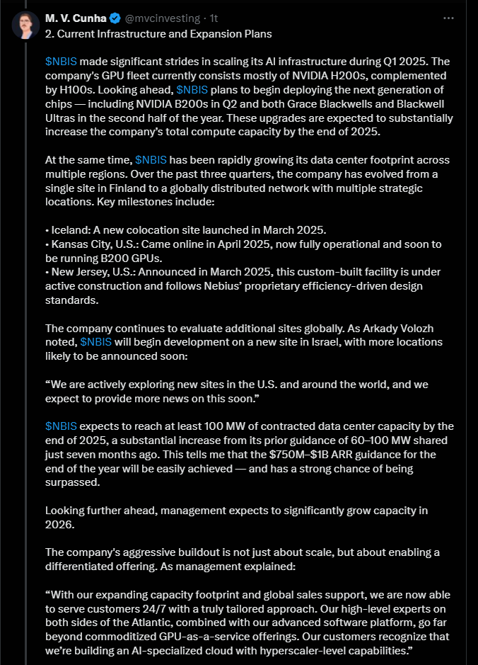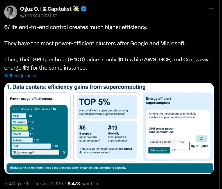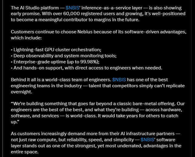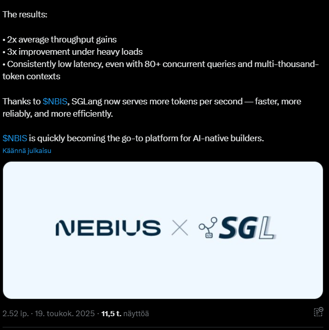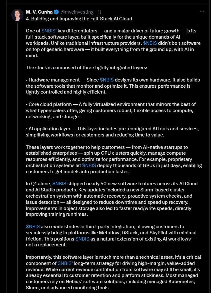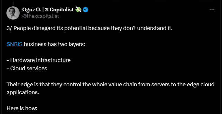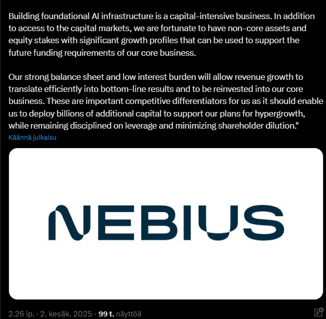 Tviitissä tuodaan esille ennestään tuttuja asioita mm. miten Nebius tarjoaa pilvi-infrastruktuuria tekoäly- ja yrityssovelluksiin ja toimii nopeasti kasvavalla alalla.