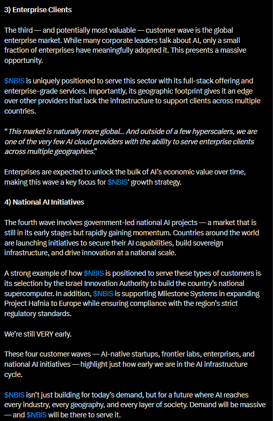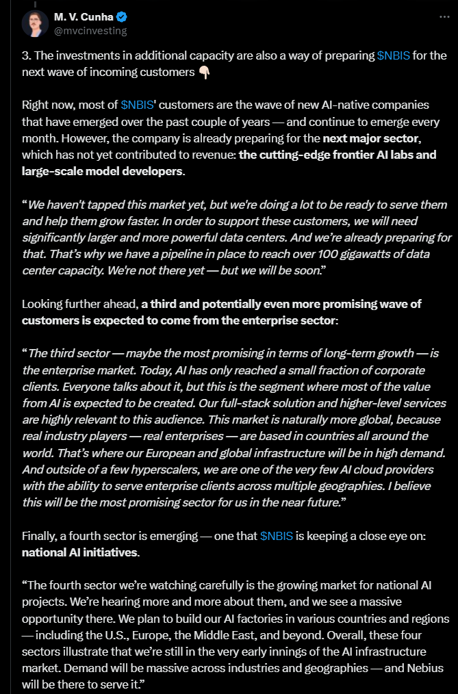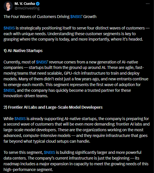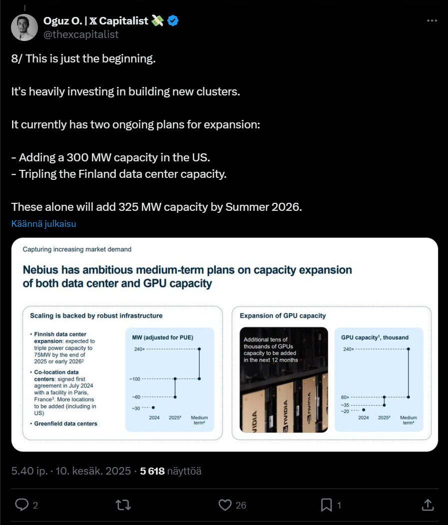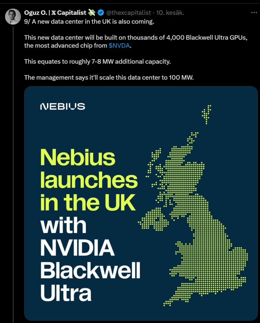 Tviittaja kertoo, että Nebius rakentaa kasvuaan neljän asiakasaallon varaan, joista ensimmäinen koostuu AI-lähtöisistä startup-yrityksistä. Ne tarvitsevat tehokasta, skaalautuvaa infrastruktuuria mallien koulutukseen ja käyttöönottoon. Toinen aalto muodostuu huipputason tekoälylaboratorioista ja "suurten mallien kehittäjist"ä, joiden vaatimukset ovat huomattavasti suuremmat. Tätä varten juuri Nebius laajentaa kapasiteettiaan merkittävästi.