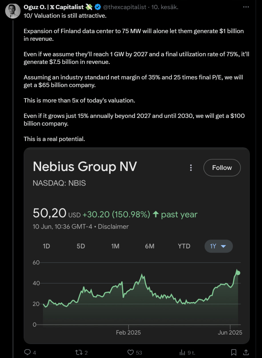 Tässä on “10 stocks which could become 5-baggers”-tviittiketjusta bongattu näkemys Nebiuksesta.