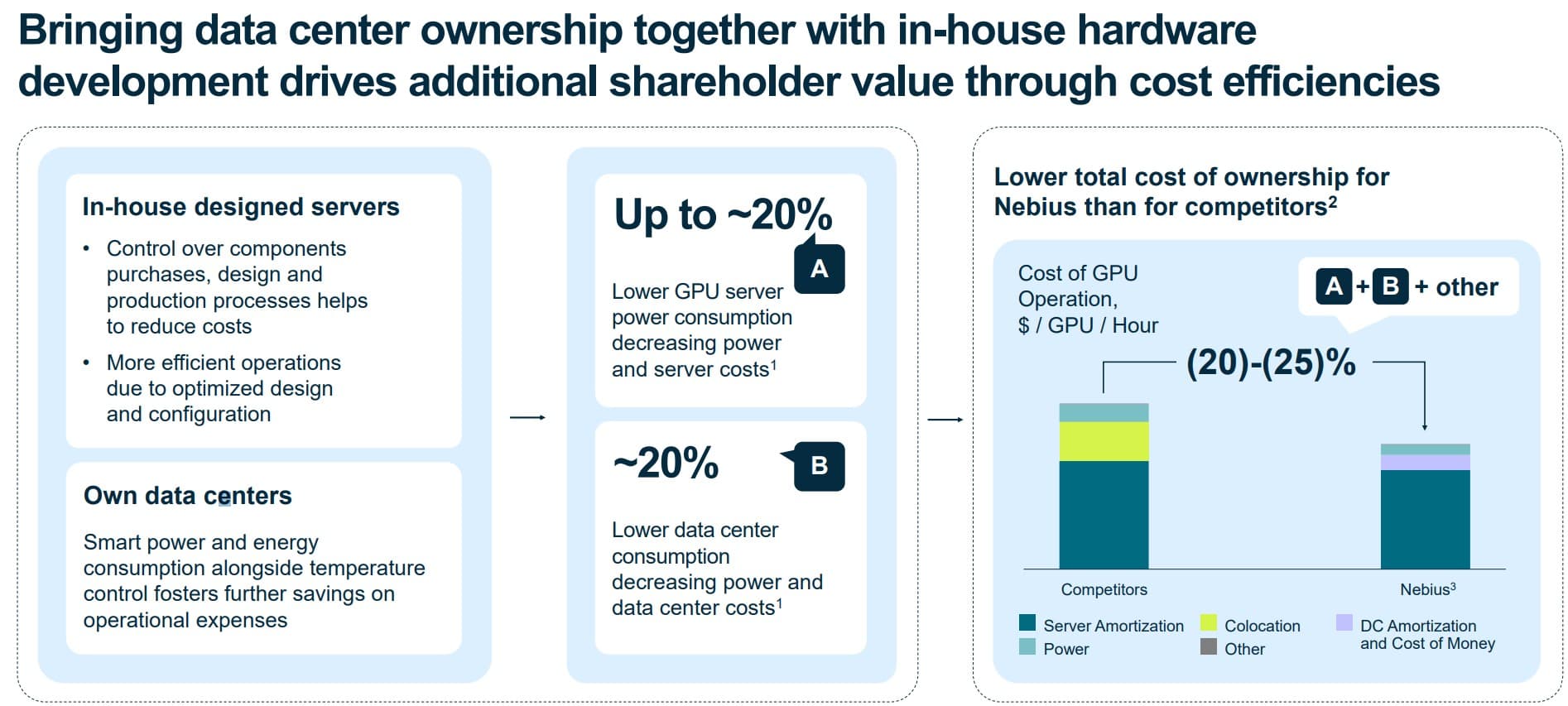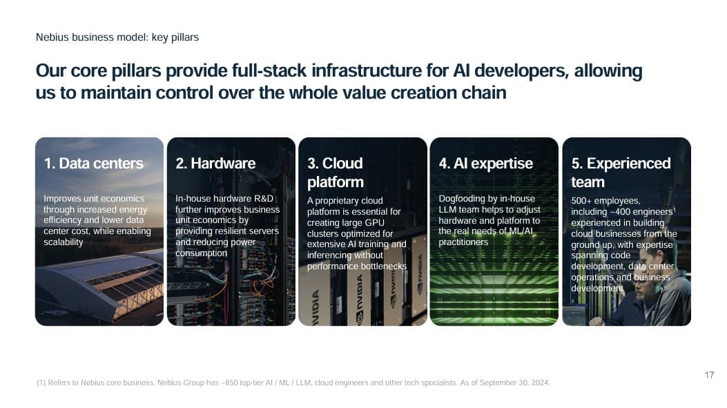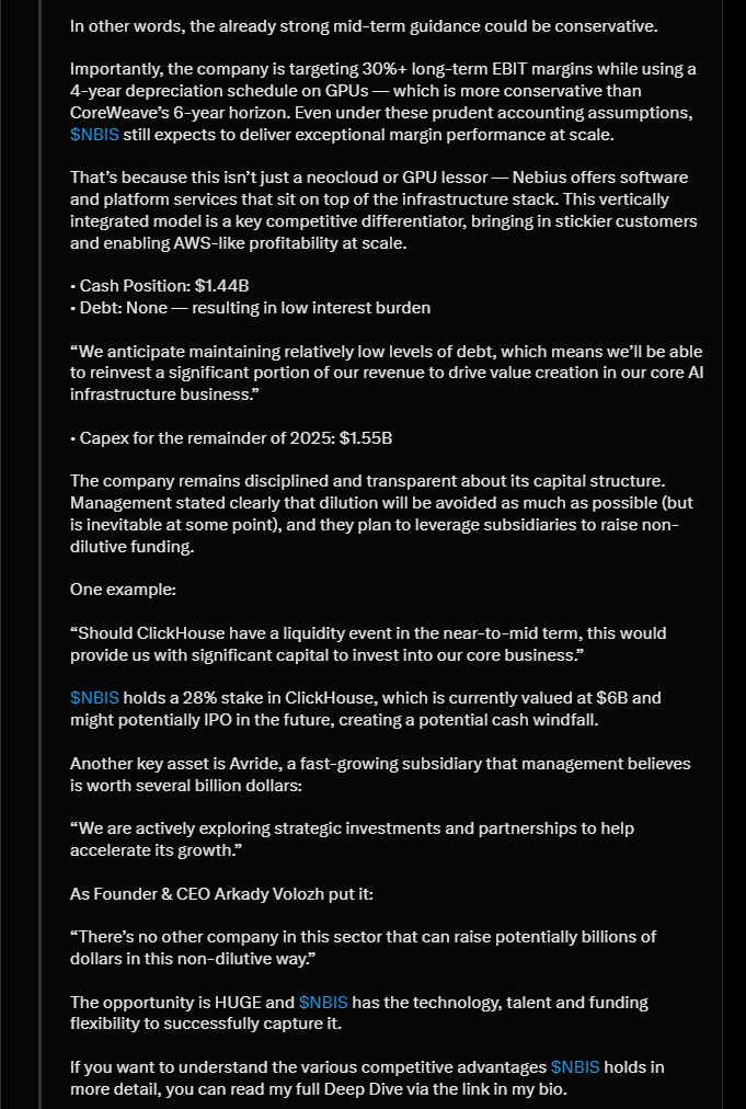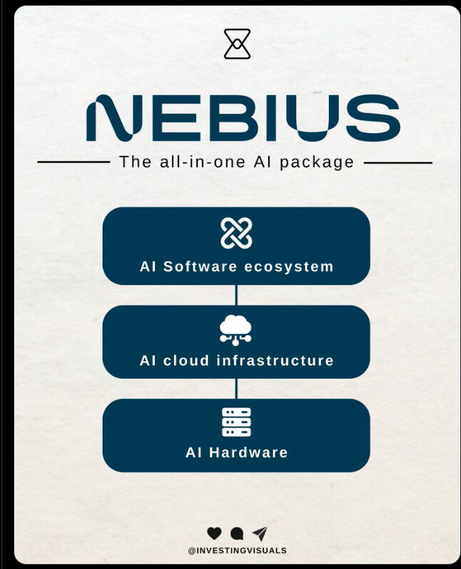 Tviittiketjun pääsanoma on (“yllätys”), että Nebius kasvaa nopeasti tekoäly- ja pilvipalveluiden kysynnän siivittämänä. Yhtiö rakentaa omia palvelimia ja datakeskuksia Eurooppaan, mikä tehostaa toimintaa ja alentaa kustannuksia, lisäksi he hallitsevat koko arvoketjua itse.