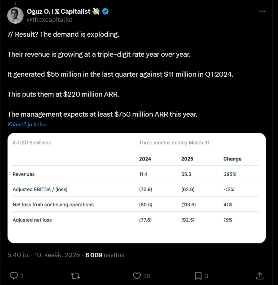 Tviitissä todetaan myös, että liikevaihto kasvaa nopeasti, mikä on yleensä ominaista SaaS-yrityksille, mutta ei just ns. raskaille AI-pilvipalveluille.