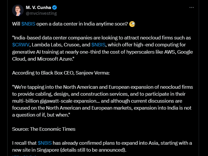 Alla olevan tviitin mukaan Nebiuksen painopiste on vielä Pohjois-Amerikassa ja Euroopassa niin laajentuminen Intiaan on vain ajan kysymys. Yhtiö on jo tosin ilmoittanut laajentavansa Aasiaan, aloittaen ensiksi Singaporessa.