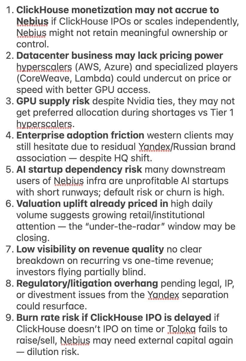 Coreweave näyttää pelottavaa esimerkkiä miten paljon täytyy sijoittaa jatkuvasti kun suorittimet maksaa hunajaa ja uusia aina vain tehokkaampia suorittimia tulee muutaman kuukauden välein Nvidialta markkinoille. Uusimmalla rahoituskieroksella coreweave joutuu maksamaan jo 9,25% korkoa lainastaan. Nebius maksaa vasta 2% ja 3% ja koska se pitkälle itse tekee kaiken mahdollisen saa se rahalle vastinetta, mutta on selvää että Nebius tulee ottamaan huomattavasti lisää lainaa sekä myymään osia pois itsestään viellä tänä vuonna, jos se haluaa kasvaa samaan tahtiin kuin nyt alkuvuonna.
