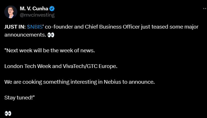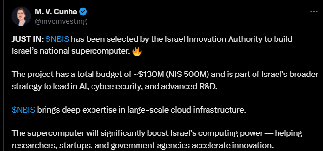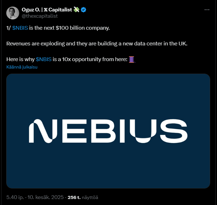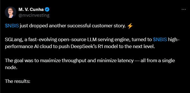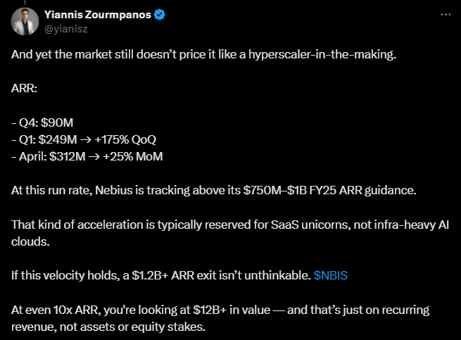 The tweet highlights already familiar things, such as how Nebius offers cloud infrastructure for AI and enterprise applications and operates in a rapidly growing sector.