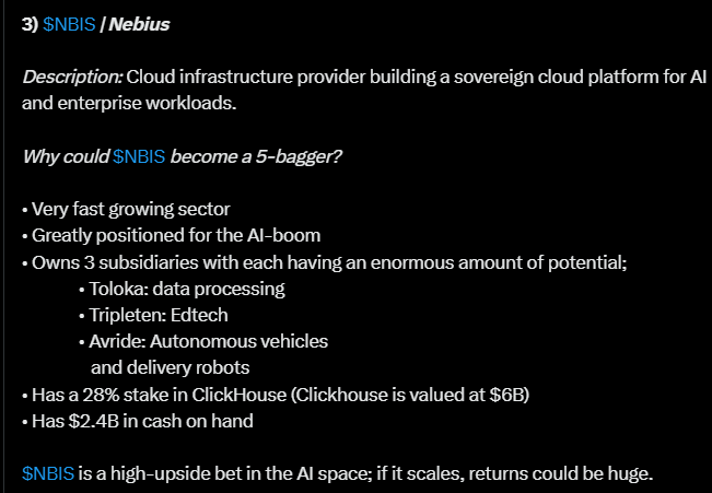 Here’s a view on Nebius spotted from the tweet thread “10 stocks which could become 5-baggers”.