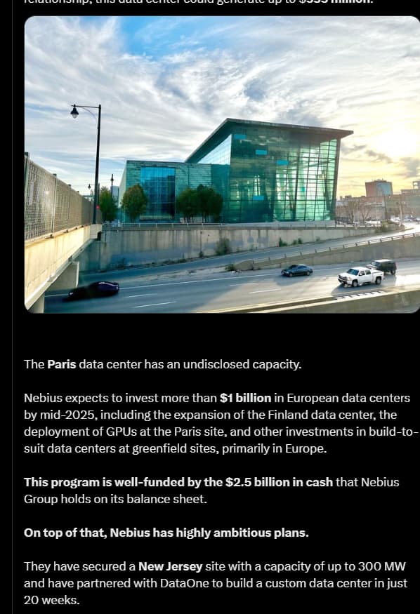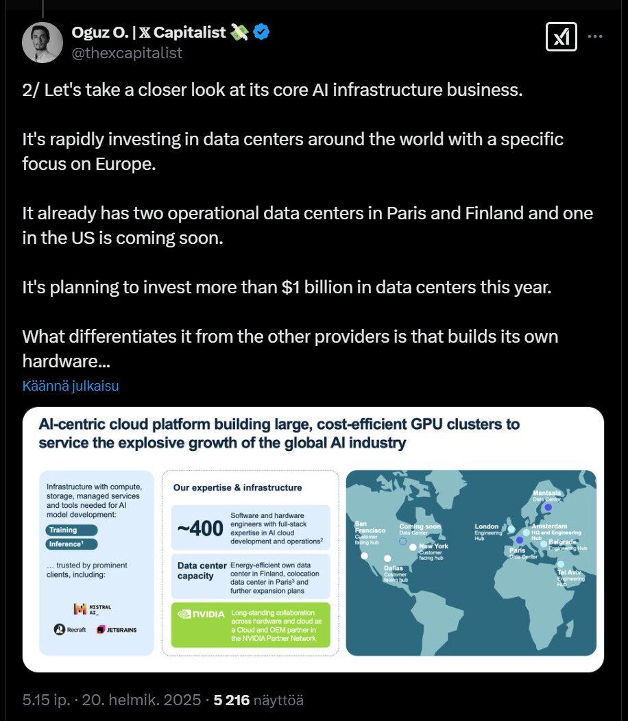 Nebiuksella on Mäntsälän konesali (sisällä paljon Nvidiaa), lisäksi uudet palvelinkeskukset ovat nousemassa Pariisiin ja Kansas Cityyn. Yhtiön asiakkaana on mm. ranskalainen Mistral.ai. Lisäksi yhtiöllä on AI:n kehittämiseen ja kouluttamiseen liittyvää osaamista. Myöskin autonomiseen ajamiseen liittyvää osaamista on. Hyvä setti tutustua yhtiöön on täällä: