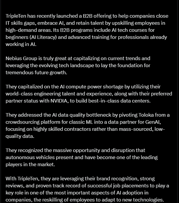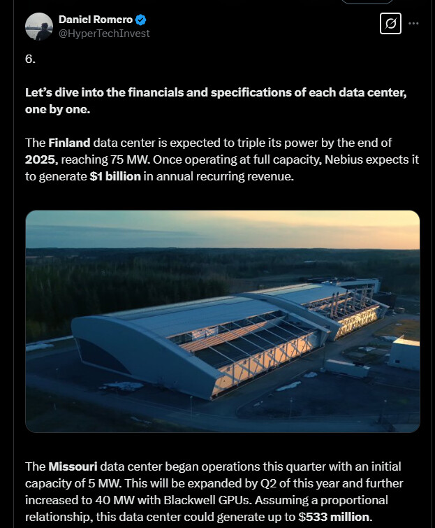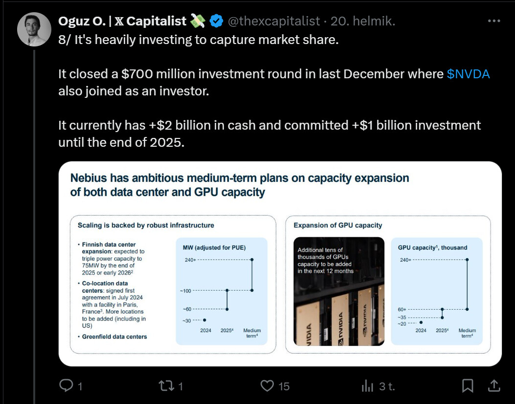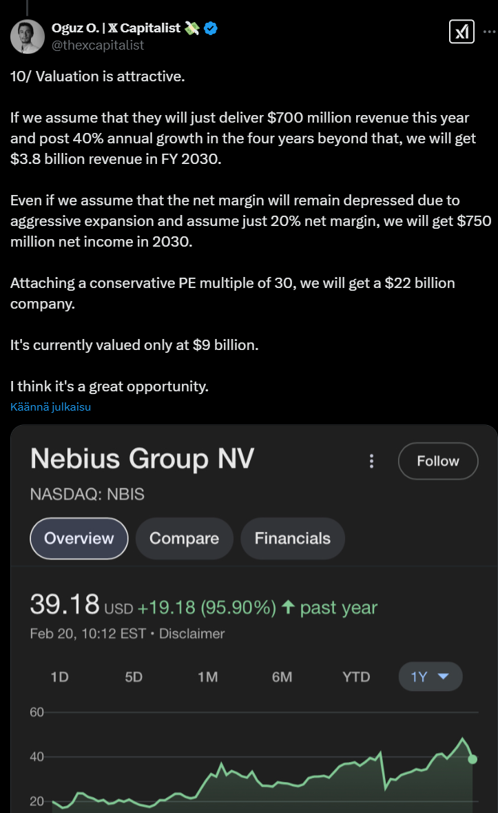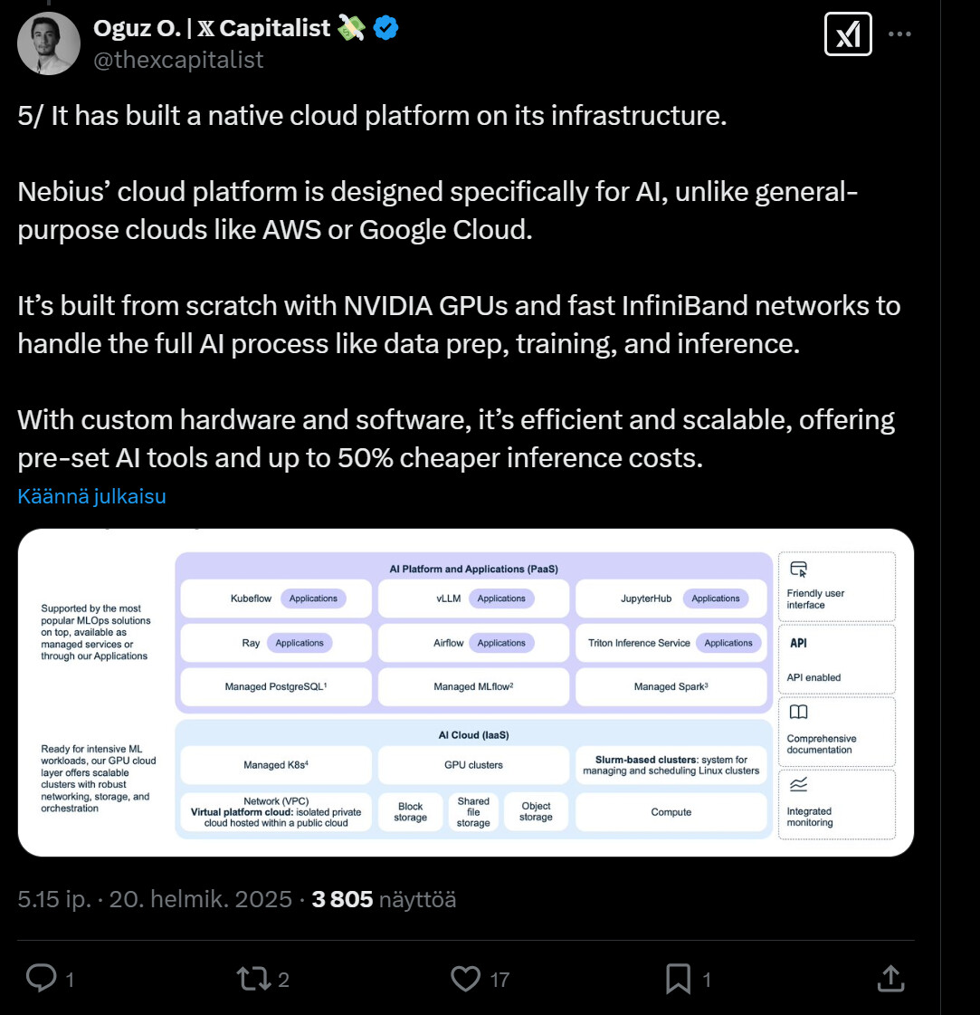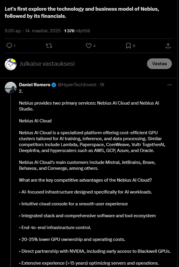 Nebius on vielä pieni, mutta pääomasijoittajien kautta se on päässyt jaloilleen ja kasvaa nopeasti. Heidän keskeisin palvelu on tarjota AI laskentakapasiteettia riippumattomille AI kehittäjille. Tässä minusta piilee isoin riski. Amerikkalaiset megafirmat saavat varmasti Nvidian GPU:t edullisemmilla hinnoilla kuin Nebius. Eli megateknot pystyvät tarjoamaan kapasiteettia lähtökohtaisesti Nebiusta halvemmalla. Mutta avasin tämän ketjun juuri tämän takia, että pystyisimme yhdessä ymmärtämään, miten ja minne asti Volozh aikoo Nebiuksella mennä.