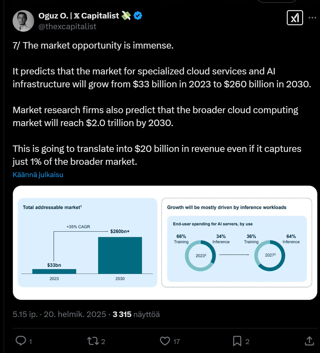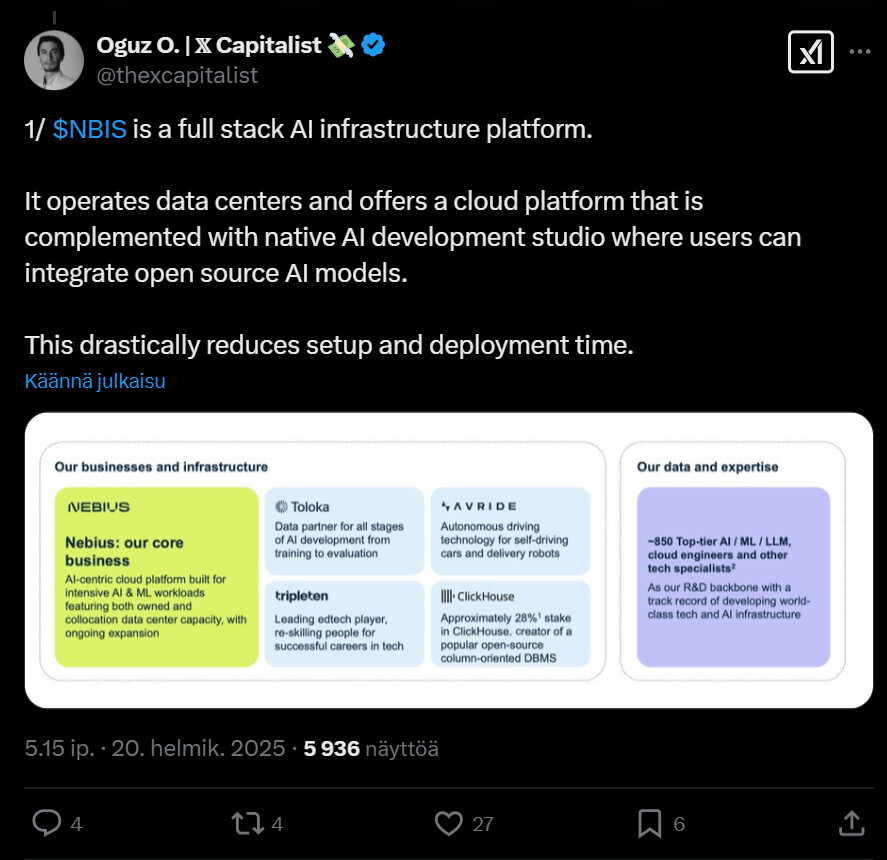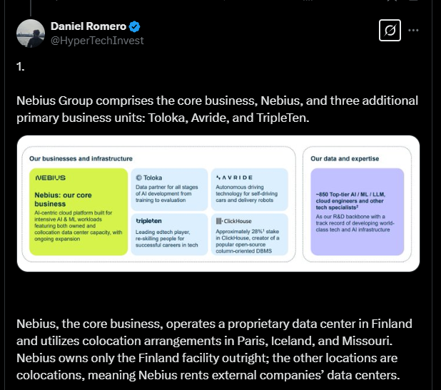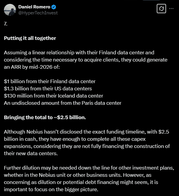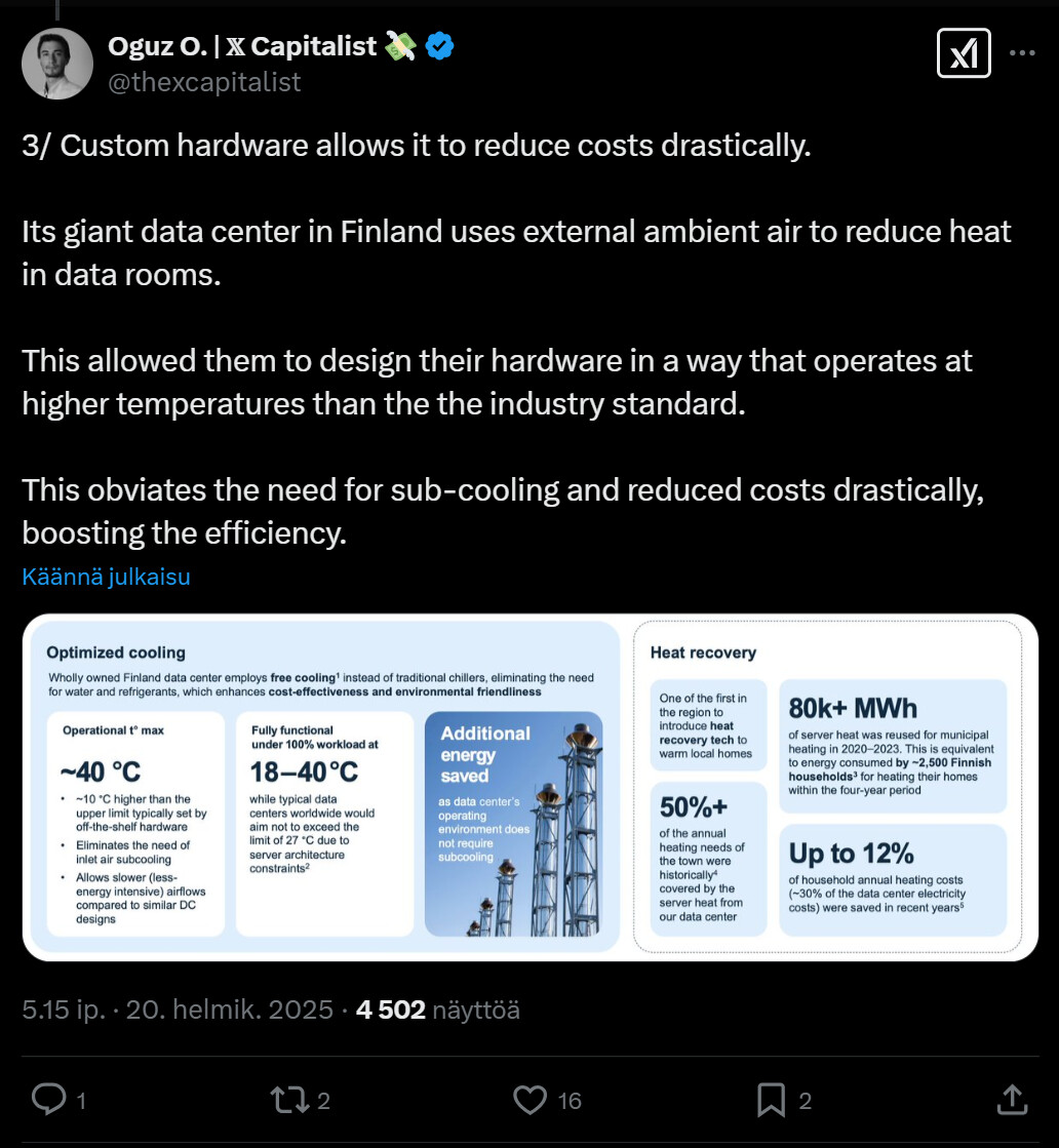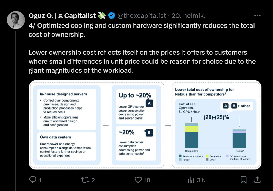 Nebius on vielä pieni, mutta pääomasijoittajien kautta se on päässyt jaloilleen ja kasvaa nopeasti. Heidän keskeisin palvelu on tarjota AI laskentakapasiteettia riippumattomille AI kehittäjille. Tässä minusta piilee isoin riski. Amerikkalaiset megafirmat saavat varmasti Nvidian GPU:t edullisemmilla hinnoilla kuin Nebius. Eli megateknot pystyvät tarjoamaan kapasiteettia lähtökohtaisesti Nebiusta halvemmalla. Mutta avasin tämän ketjun juuri tämän takia, että pystyisimme yhdessä ymmärtämään, miten ja minne asti Volozh aikoo Nebiuksella mennä.