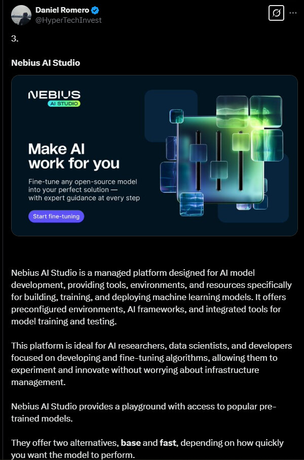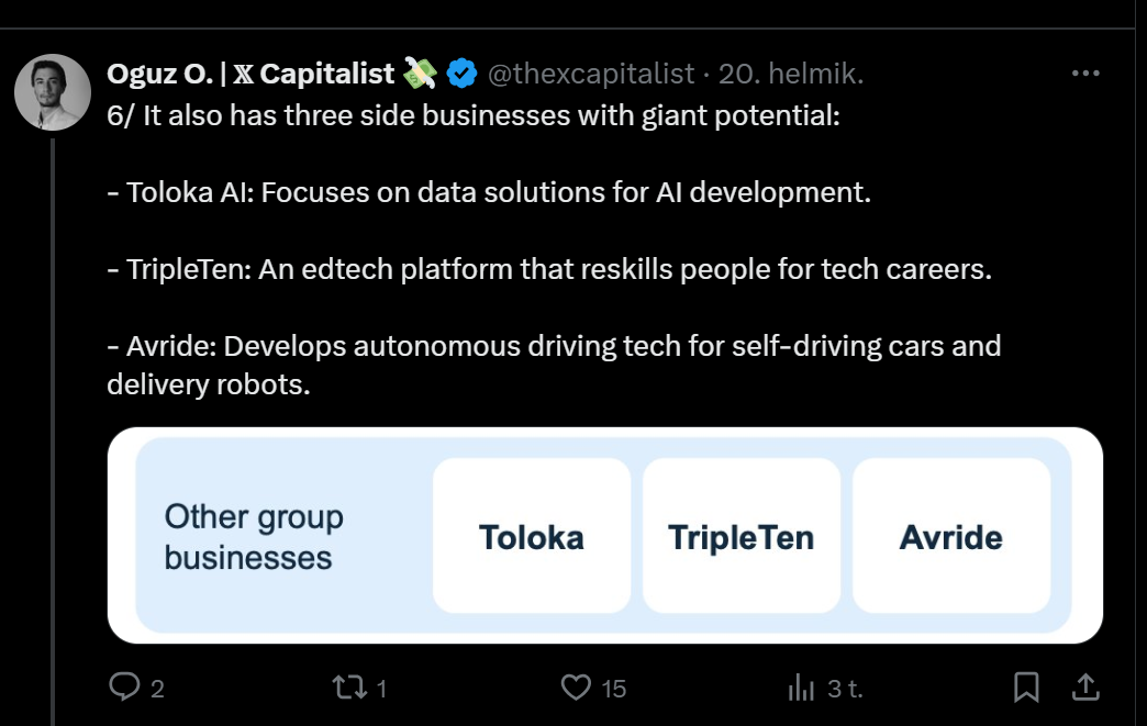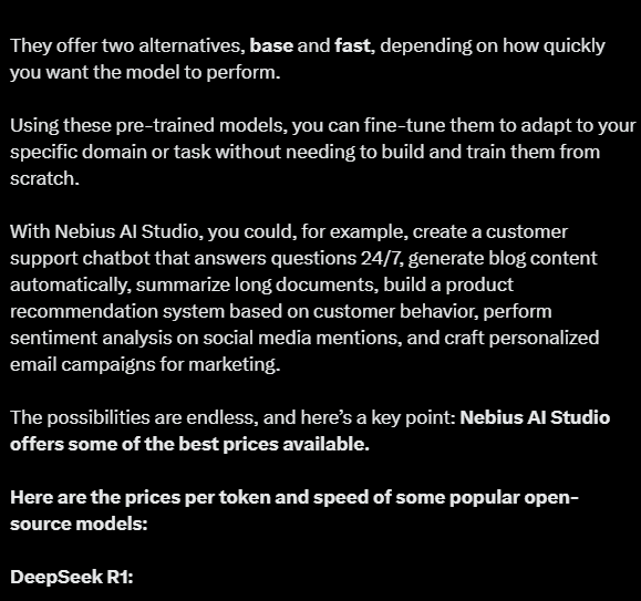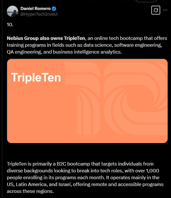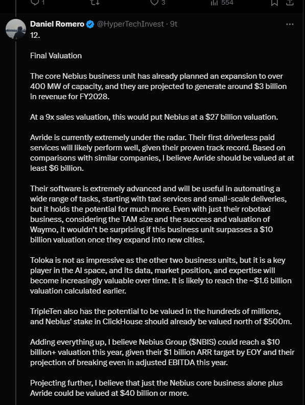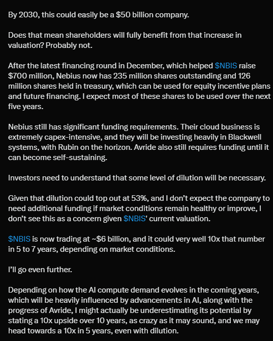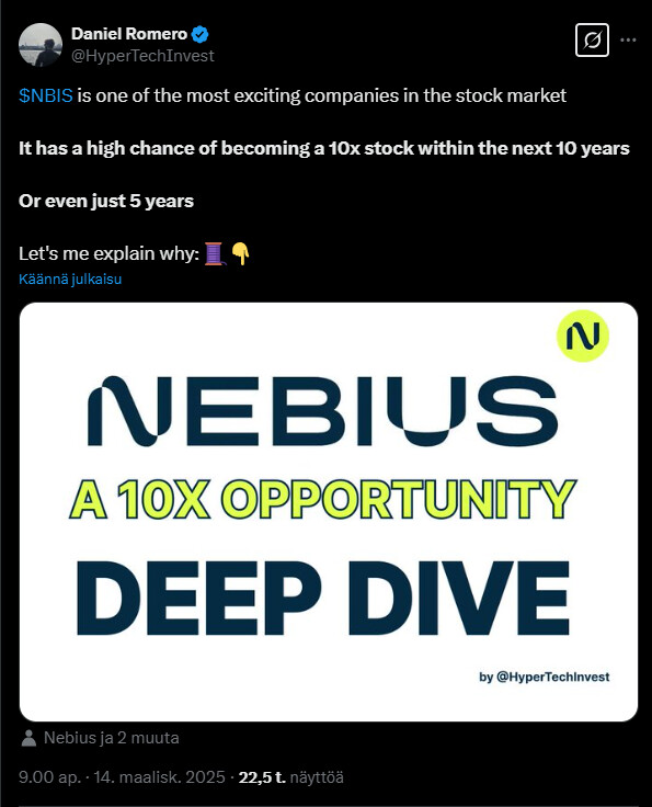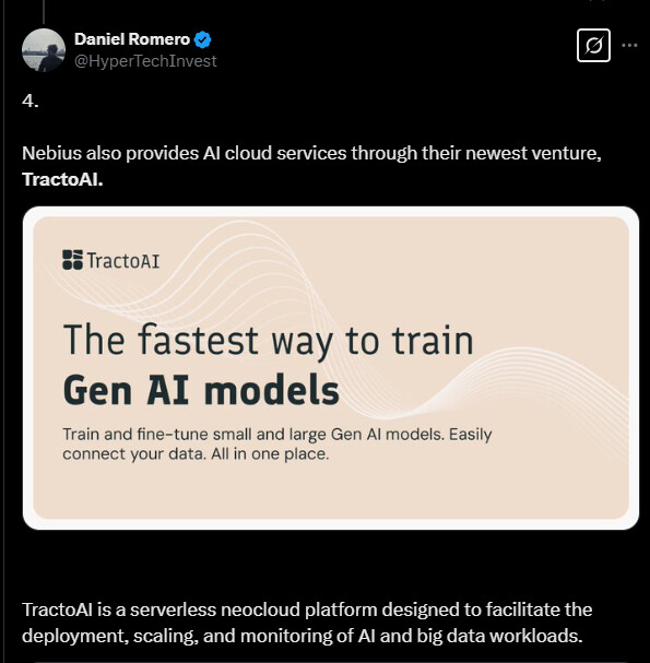 Nebius on vielä pieni, mutta pääomasijoittajien kautta se on päässyt jaloilleen ja kasvaa nopeasti. Heidän keskeisin palvelu on tarjota AI laskentakapasiteettia riippumattomille AI kehittäjille. Tässä minusta piilee isoin riski. Amerikkalaiset megafirmat saavat varmasti Nvidian GPU:t edullisemmilla hinnoilla kuin Nebius. Eli megateknot pystyvät tarjoamaan kapasiteettia lähtökohtaisesti Nebiusta halvemmalla. Mutta avasin tämän ketjun juuri tämän takia, että pystyisimme yhdessä ymmärtämään, miten ja minne asti Volozh aikoo Nebiuksella mennä.