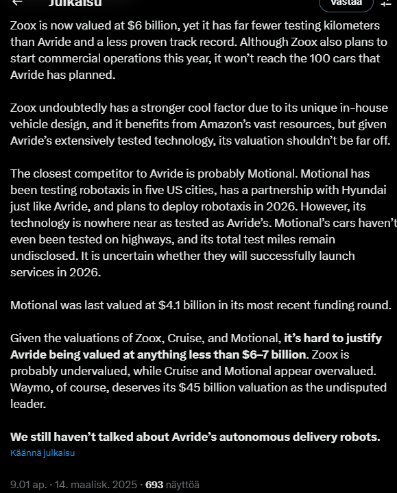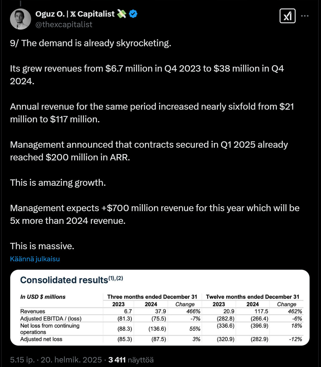 Talouslukuja voi tarkemmin tutkia netistä tai alla jakamastani linkistä. Vuoden 2024 lopussa yhtiöllä oli n. 200 miljoonan vuotuinen laskutus ja vuoden 2025 lopussa yhtiö ennustaa miljardin vuotuista laskutustasoa. Yhtiö ennustaa adj. EBITDA:n nousevan plussalle vuoden 2025 aikana.